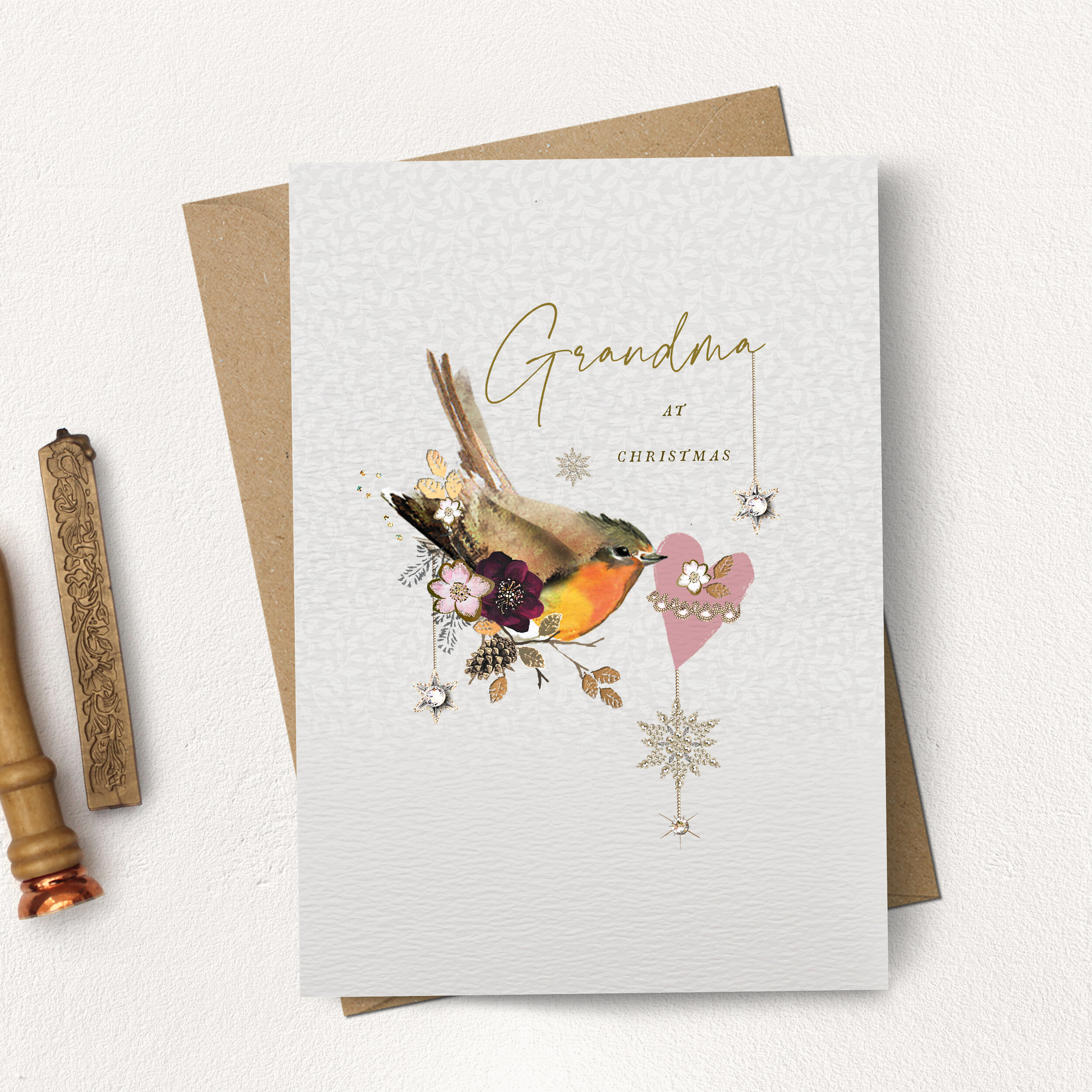 From the ‘Winter Forest’ collection, this greetings card features a painting of a robin with winter florals. Hand finished with stamped copper foil detailing and crystals.